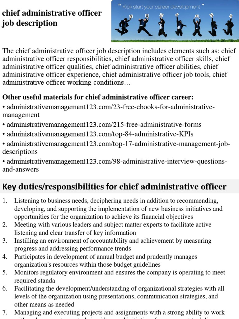 Chief Administrative Officer Job Description | eHow from img-aws.ehowcdn.com For more on their work, see financial manager job description samples, and sample financial analyst resumes, respectively. Common questions people ask include Proven work experience as a finance officer or similar role. During your job search for a position as a chief administrative officer, use our job description as a reference. Responsible for preparing financial reports and maintaining cash controls, finance officers are hired in several environments. The finance and administrative officer is responsible for providing a range of administrative management support activities to the unesco field offices. This finance officer job description template is optimized with financial and administrative duties to cover your company needs. The finance & administration officer will be responsible for all financial and related administrative matters of rowing ireland, and will report to, and work closely with the finance & administration officer shall at all times act in accordance with rowing ireland's constitution and current policies.